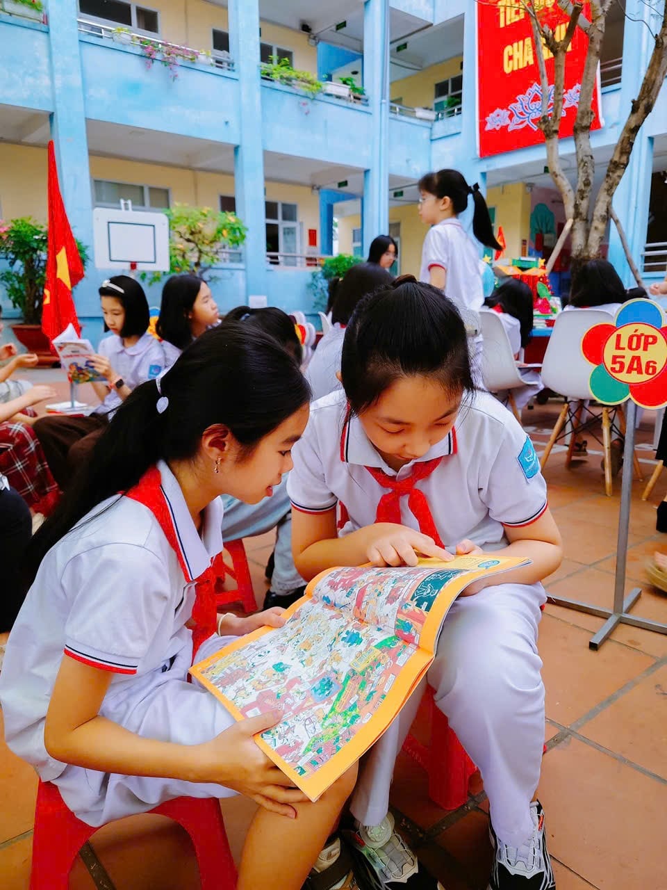 Mỗi khối lớp từ khối 1 đến khối 5 đều mang đến những gian hàng sách rực rỡ, sáng tạo và đầy ý nghĩa, với cách bài trí theo từng chủ đề lịch sử và đạo đức, mang đậm dấu ấn riêng của từng khối. Các em học sinh không chỉ được đọc sách, chia sẻ cảm nhận về những trang sách hay, mà còn tự do trao đổi sách, truyện, từ đó phát triển tinh thần đọc chủ động và niềm yêu thích với tri thức.